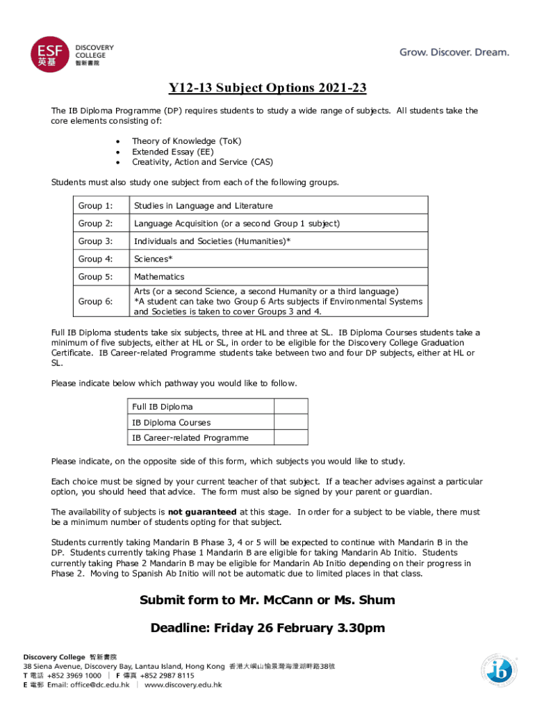 Proceed to indicate the subjects or courses you wish to study in year 12-13 for the 2021-23 academic years.
