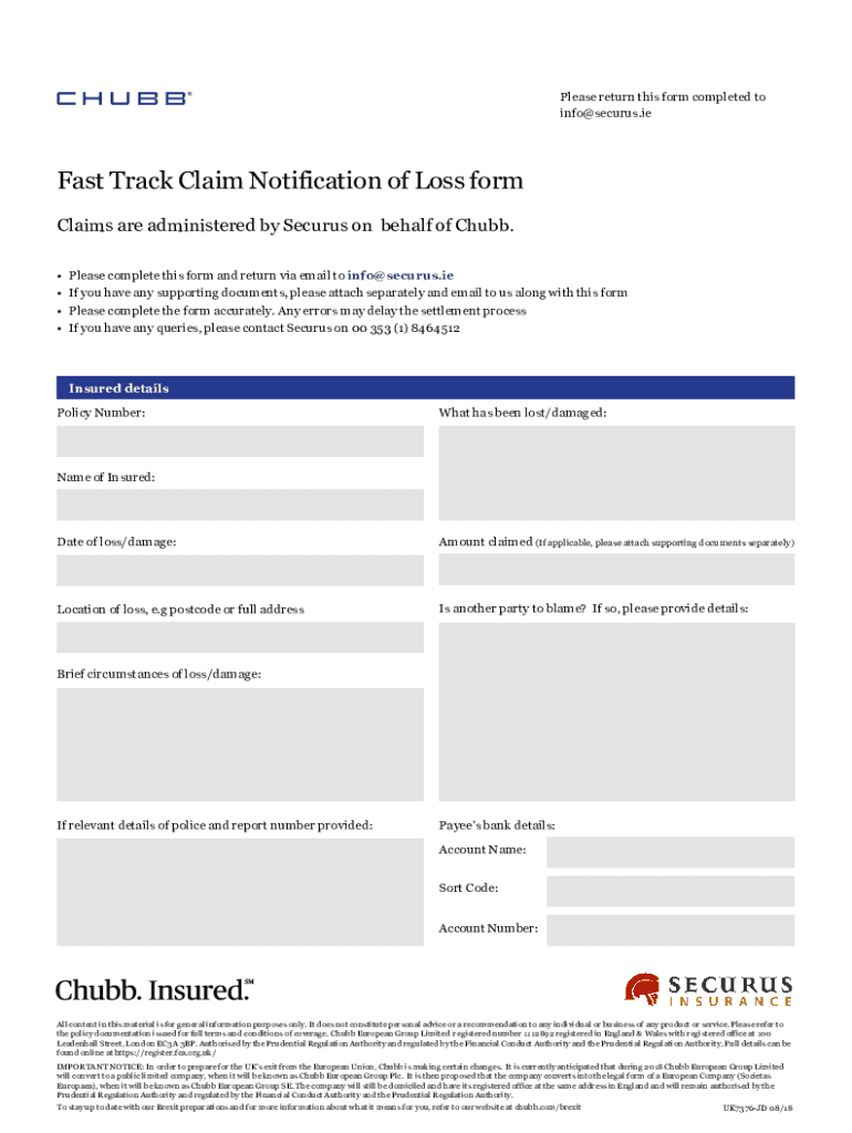 Please return this form completed to info@securus.ieFast Track Claim Notification of Loss form Claims are administered by Secures on behalf of Chubb. Please complete this form and return via email