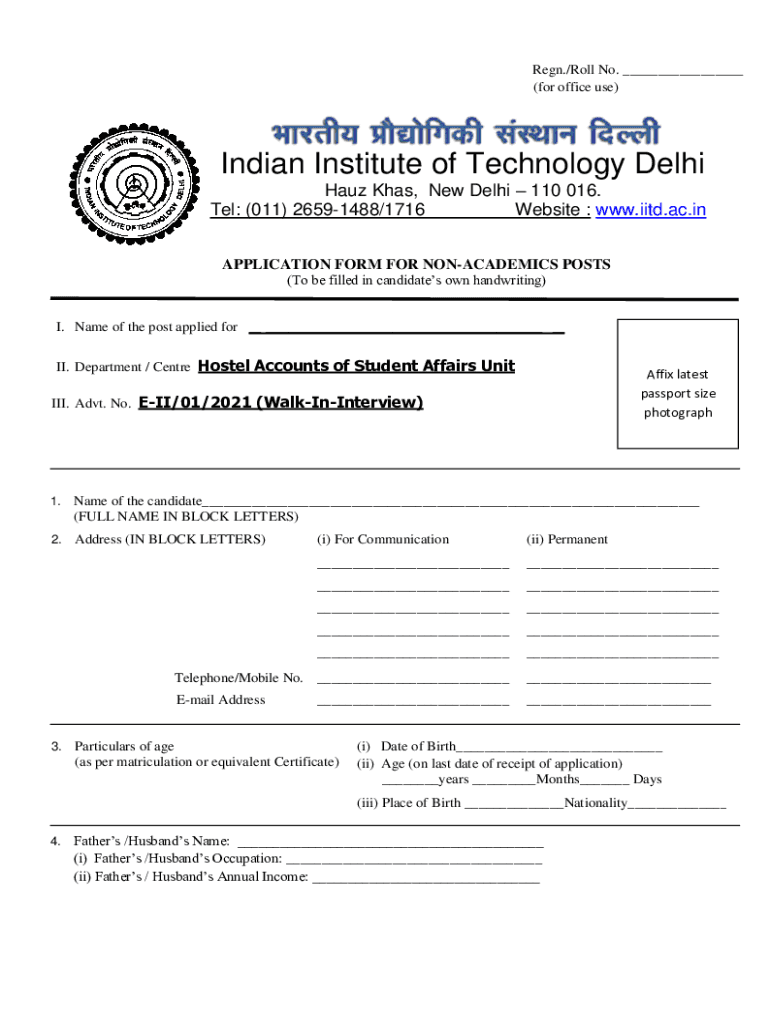Reign./Roll No. (for office use)Indian Institute of Technology Delhi Haul Has, New Delhi 110 016. Tel: (011) 26591488/1716 Website : www.iitd.ac.in APPLICATION FORM FOR NONACADEMIC POSTS (To be filled