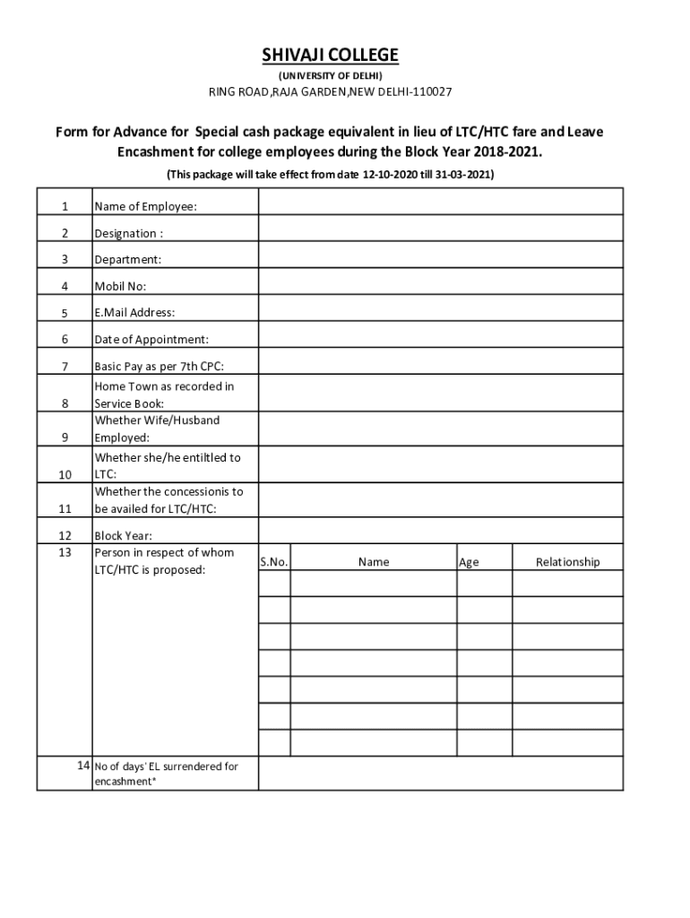 SHIV AJI COLLEGE (UNIVERSITY OF DELHI)RING ROAD, RAJA GARDEN, NEW DELHI110027Form for Advance for Special cash package equivalent in lieu of LTC/HTC fare and Leave Encasement for college employees