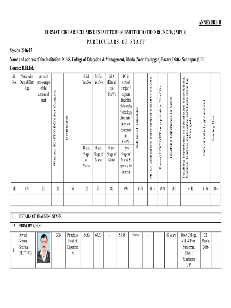 ANNEXUREII FORMAT FOR PARTICULARS OF STAFF TO BE SUBMITTED TO THE NRC, NOTE, JAIPUR PARTICULARS STAFF(3)(4)I.DETAILS OF TEACHING STAFF(A)PRINCIPAL/HOD1. Arvind Kumar Sharma, 21.07.1975GENIf yes, age