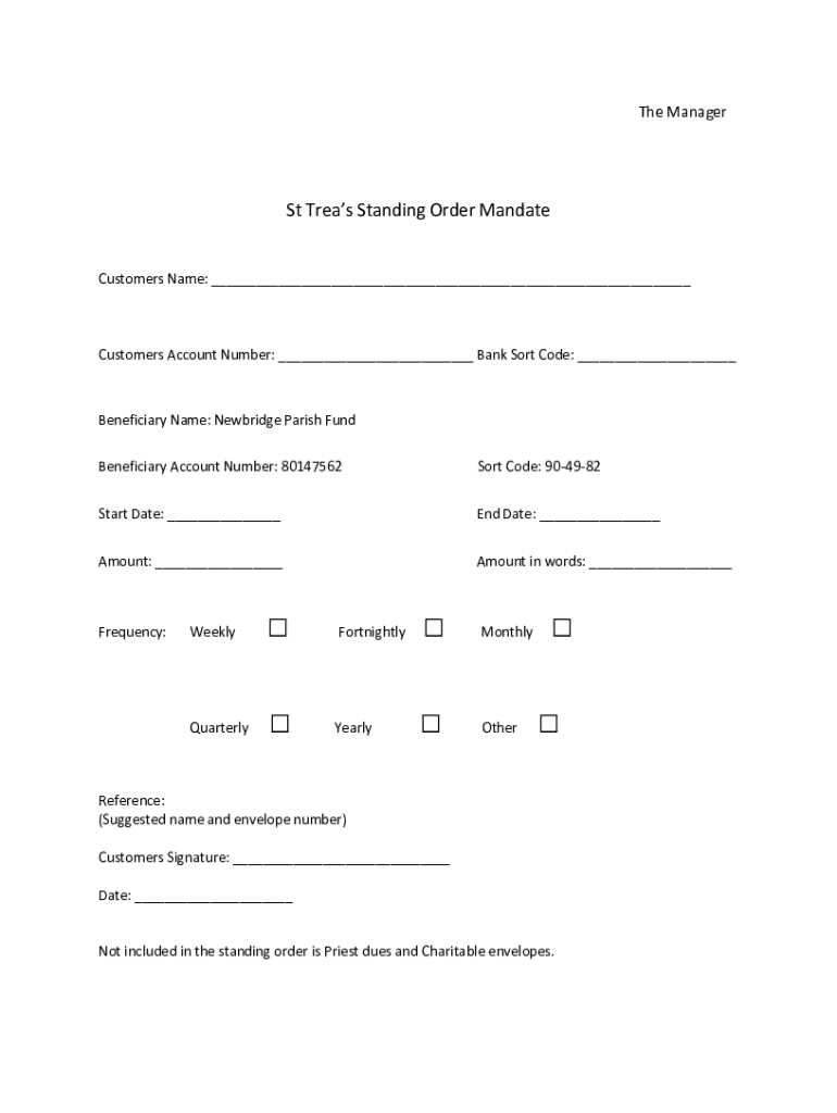 The Managers Treas Standing Order MandateCustomers Name: Customers Account Number: Bank Sort Code: Beneficiary Name: New bridge Parish Fund Beneficiary Account Number: 80147562Sort Code: 904982Start
