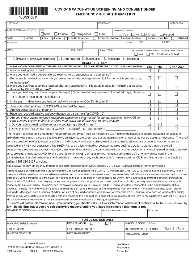 COVID-19 VACCINATION SCREENING AND CONSENT UNDER EMERGENCY USE AUTHORIZATION * *DATE OF BIRTH (MM/DD/YYY):White* RACE: * ADDRESS:* *FIRST NAME:LAST NAME:SEX:Male BlackMIDDLE INITIAL: HISPANIC ETHNICITY:Female