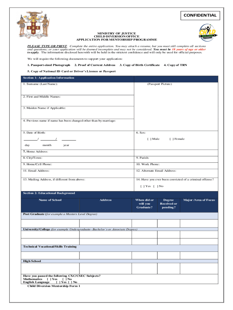 CONFIDENTIALMINISTRY OF JUSTICE CHILD DIVERSION OFFICE APPLICATION FOR MENTORSHIP Program PLEASE TYPE OR PRINT. Complete the entire application. You may attach a resume, but you must still complete