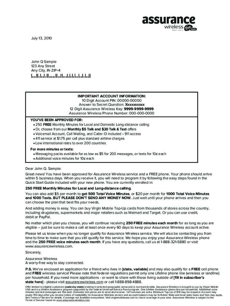 July 13, 2010John Q Sample 123 Any Street Any City, IN ZIP+4s146132544s IMPORTANT ACCOUNT INFORMATION: 10-Digit Account PIN: 0000000000 Answer to Secret Question: Xxxxxxxxxx 12 Digit Assurance Wireless