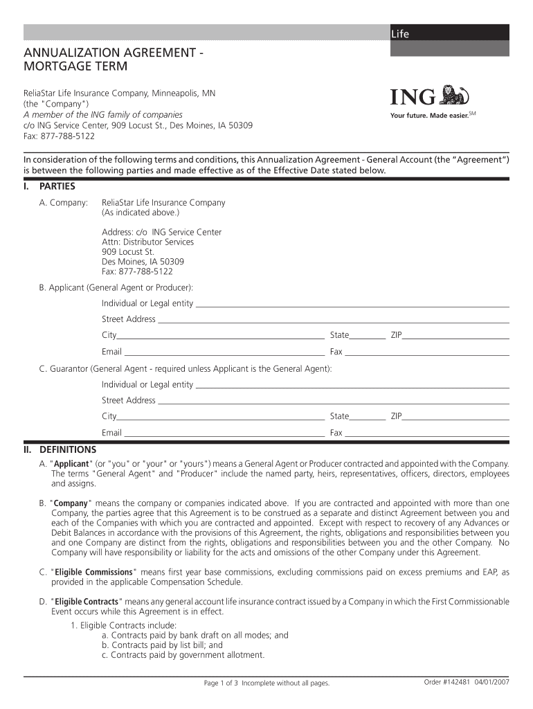 RESET FORM Life ANNUALIZATION AGREEMENT MORTGAGE TERM Register Life Insurance Company, Minneapolis, MN (the Company “) A member of the ING family of companies c/o ING Service Center, 909 Locust