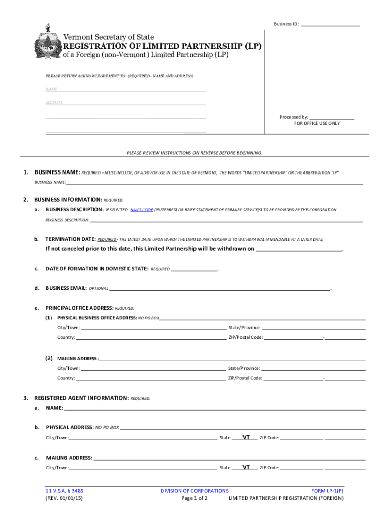 Business ID:Vermont Secretary of State REGISTRATION OF LIMITED PARTNERSHIP (LP) of a Foreign (nonVermont) Limited Partnership (LP) PLEASE RETURN ACKNOWLEDGMENT TO: (REQUIRED NAME AND ADDRESS)NAME