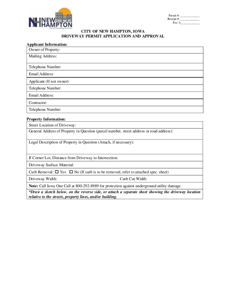 Permit #: Receipt #: Fee: $ CITY OF NEW HAMPTON, IOWA DRIVEWAY PERMIT APPLICATION AND APPROVAL Applicant Information: Owner of Property: Mailing Address: Telephone Number: Email Address: Applicant
