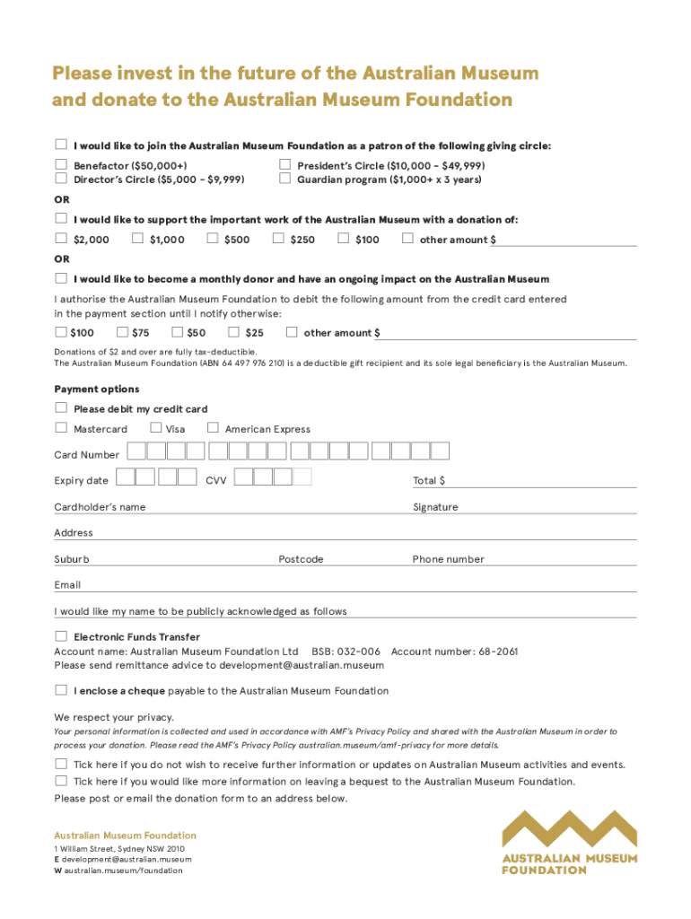 Please invest in the future of the Australian Museum and donate to the Australian Museum Foundation n I would like to join the Australian Museum Foundation as a patron of the following giving circle: