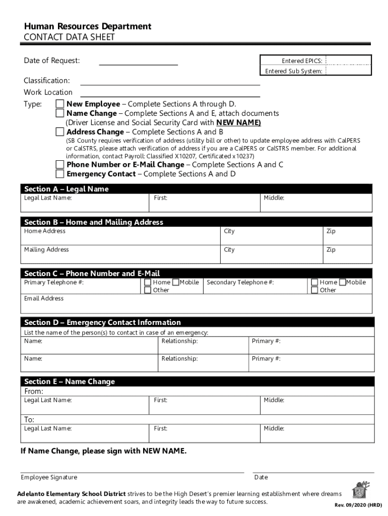 Human Resources Department CONTACT DATA SHEET Date of Request:Entered EPICS: Entered Sub System:Classification: Work Location Type: New Employee Complete Sections A through D. Name Change Complete