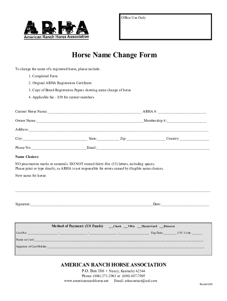 Office Use Onshore Name Change Form To change the name of a registered horse, please include: 1. Completed Form 2. Original AREA Registration Certificate 3. Copy of Breed Registration Papers showing