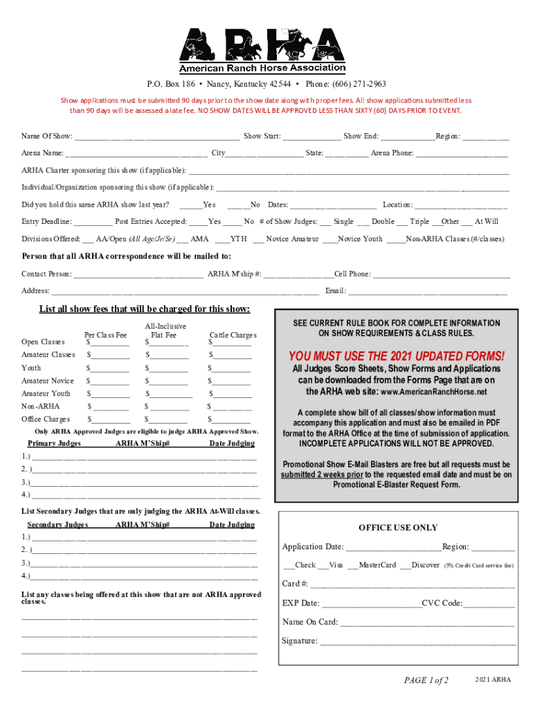 P.O. Box 186 Nancy, Kentucky 42544 Phone: (606) 2712963 Show applications must be submitted 90 days prior to the show date along with proper fees. All show applications submitted less than 90 days
