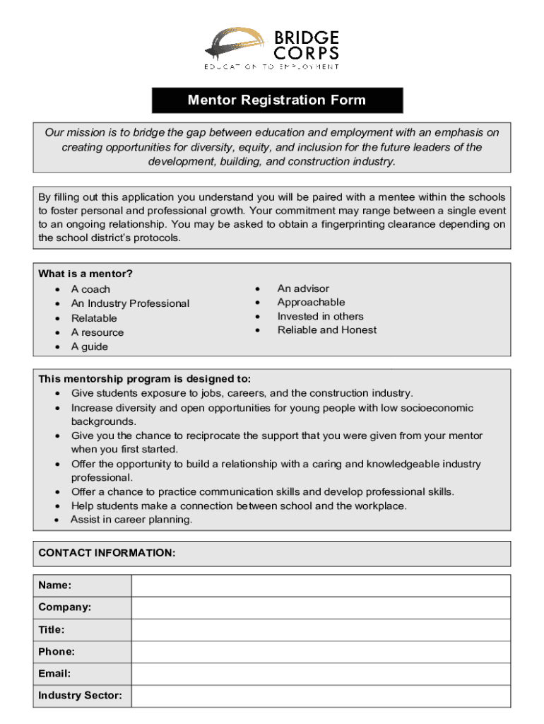 Mentor Registration Form Our mission is to bridge the gap between education and employment with an emphasis on creating opportunities for diversity, equity, and inclusion for the future leaders of