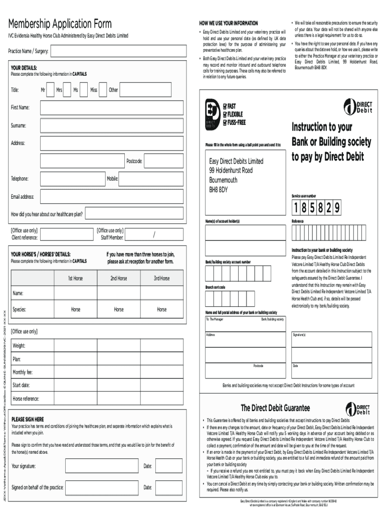 Membership Application Form WE USE YOUR INFORMATION Easy Direct Debits Limited and your veterinary practice will hold and use your personal data (as defined by UK data protection laws) for the purpose