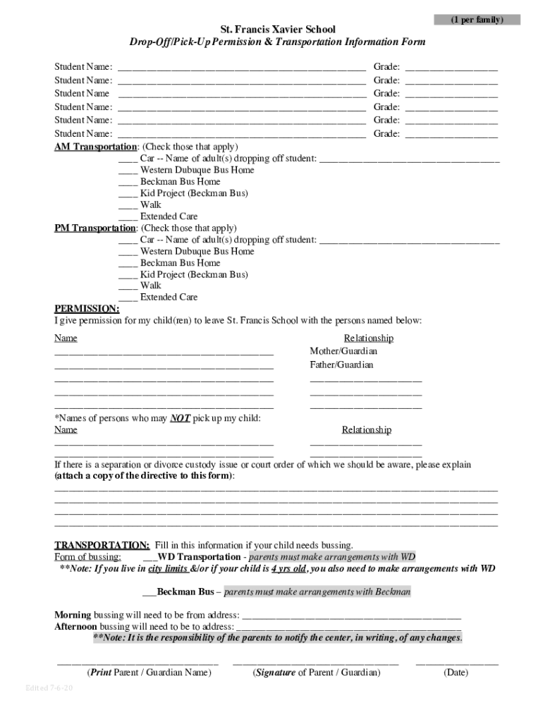 St. Francis Xavier SchoolDropOff/Pickup Permission & Transportation Information Form(1 per family)Student Name: Grade: Student Name: Grade: Student Name Grade: Student Name: Grade: Student Name: Grade: