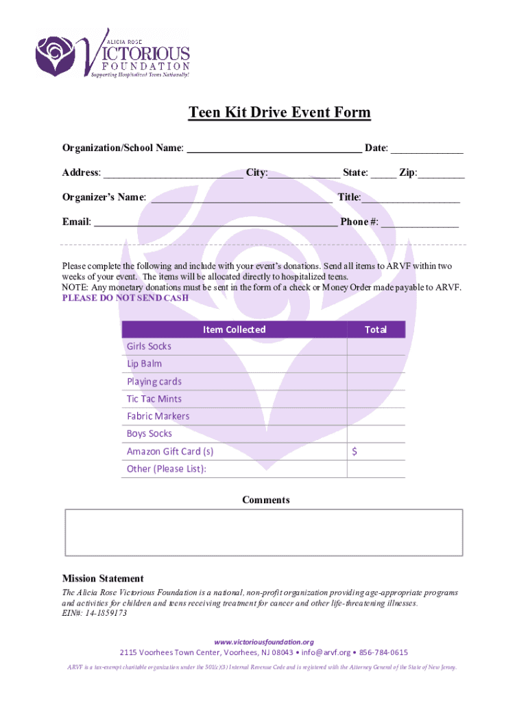 Teen Kit Drive Event Form Organization/School Name:Date: Address: City: State: Zip: Organizers Name: Title: Email:Phone #: Please complete the following and include with your events donations. Send