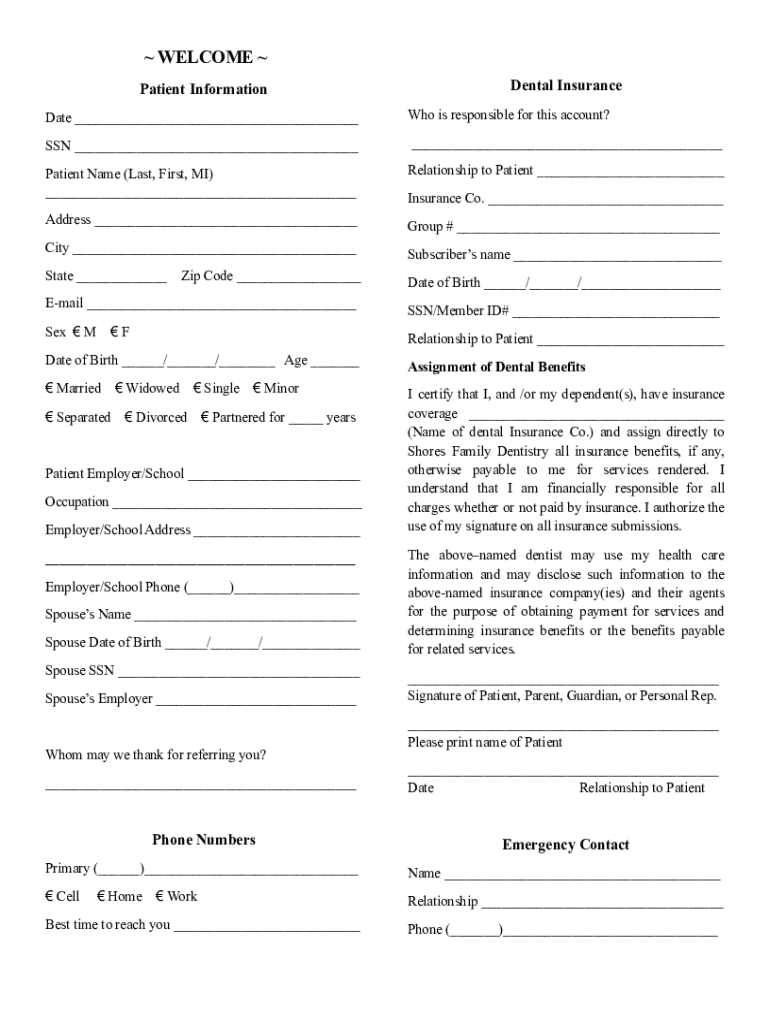 WELCOME Patient InformationDental InsuranceDate Who is responsible for this account?SSN Patient Name (Last, First, MI) Relationship to Patient Address City State Zip Code Email Insurance Co. Group