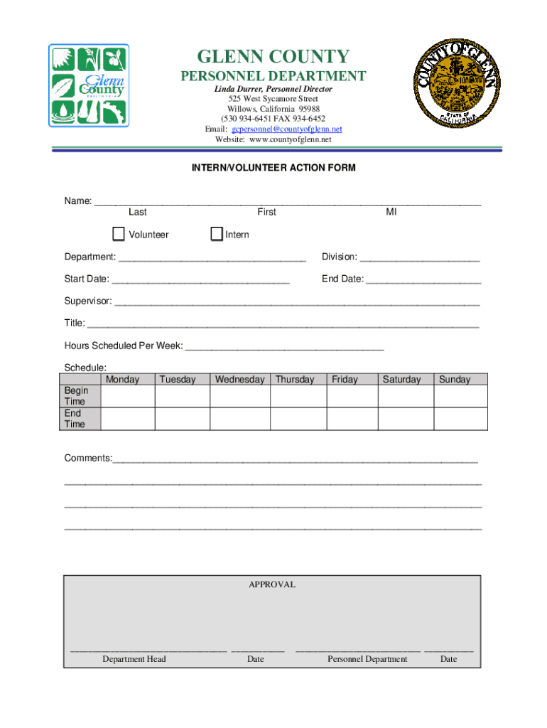 GLENN COUNTY JIO n OF'PERSONNEL DEPARTMENT Linda Durer, Personnel Director 525 West Sycamore Street Willows, California 95988 (530 9346451 FAX 9346452 Email: personnel countyofglenn.net Website: www.countyofglenn.netClLMOIMIVINTERN/VOLUNTEER