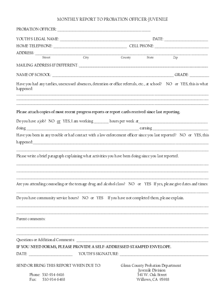 MONTHLY REPORT TO PROBATION OFFICERJUVENILE PROBATION OFFICER: YOUTHS LEGAL NAME: DATE: HOME TELEPHONE: CELL PHONE: ADDRESS: StreetCityCountyStateZipMAILING ADDRESS IF DIFFERENT: NAME OF SCHOOL: GRADE: