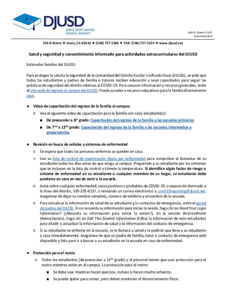 John A. Bones, Ed. D. Superintendent526 B Street Davis, CA 95616 (530) 7575300 FAX: (530) 7575323 www.djusd.netSalud y Sciuridae y consentimiento inform ado para activities extracurriculars Del DJ