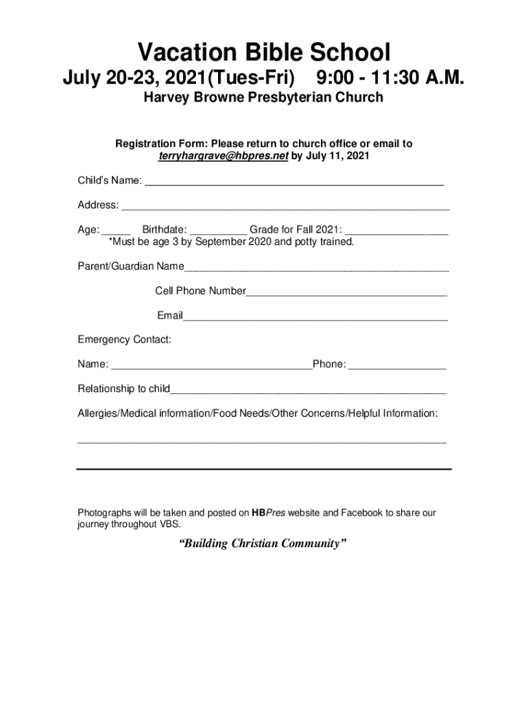 Vacation Bible School July 2023, 2021(Tues Fri)9:00 11:30 A.M. Harvey Browne Presbyterian Church Registration Form: Please return to church office or email to terryhargrave hopes.net by July 11, 2021,