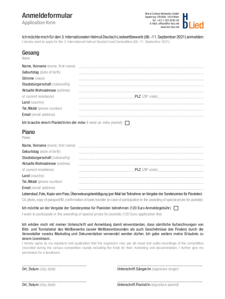 AnmeldeformularWorld Culture Networks GmbH Opening 1/R/608, 1010 Wain Tel: +43 1 522 6243 82 Email: office died.net www.hdlied.netApplication formic mate Mich for den 3. Internationale Helmut Deutsche