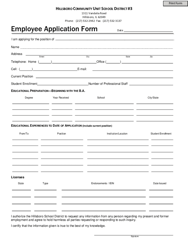 Print FormHILLSBORO COMMUNITY UNIT SCHOOL DISTRICT #3 1311 Vandalism Road Hillsboro, IL 62049 Phone: (217) 5322942 Fax: (217) 5323137Employee Application Format am I applying for the position of Name