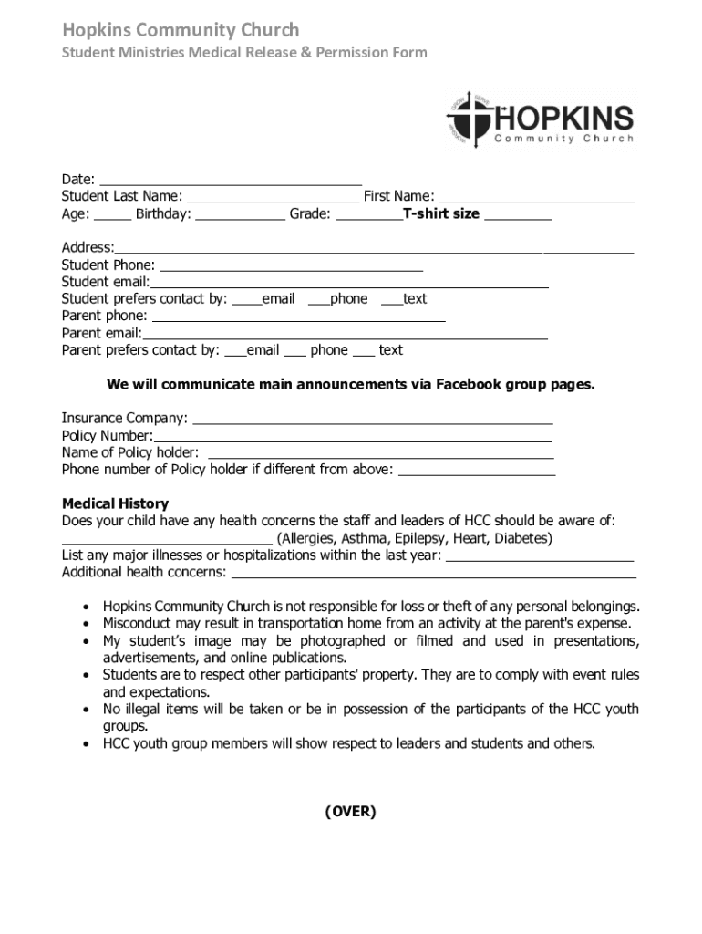 Hopkins Community Church Student Ministries Medical Release & Permission Format: Student Last Name: First Name: Age: Birthday: Grade: Shirt size Address: Student Phone: Student email: Student prefers