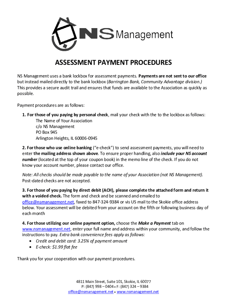 ASSESSMENT PAYMENT PROCEDURES NS Management uses a bank lockbox for assessment payments. Payments are not sent to our office but instead mailed directly to the bank lockbox (Barrington Bank, Community