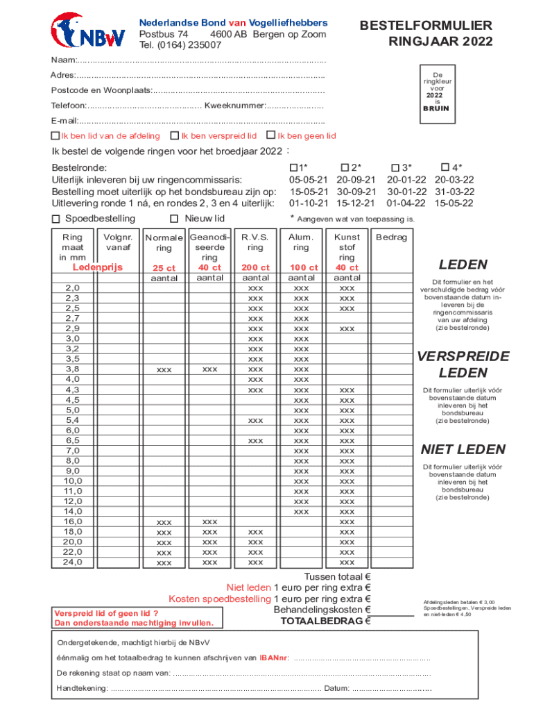 Nederland Bond van Vogelliefhebbers Postbus 74 4600 AB Bergen op Zoom Tel. (0164) 235007BESTELFORMULIER SINGULAR 2022Naam:....................................................................................................