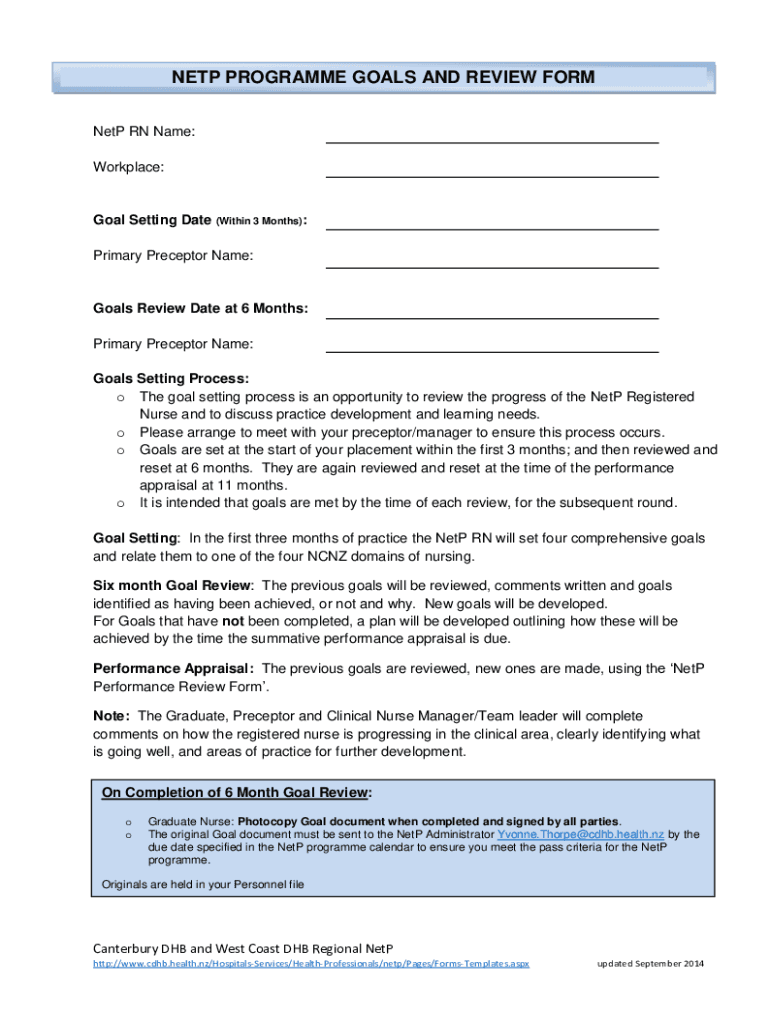 NET Program GOALS AND REVIEW FORM Net PRN Name: Workplace:Goal Setting Date (Within 3 Months): Primary Preceptor Name:Goals Review Date at 6 Months: Primary Preceptor Name: Goals Setting Process: