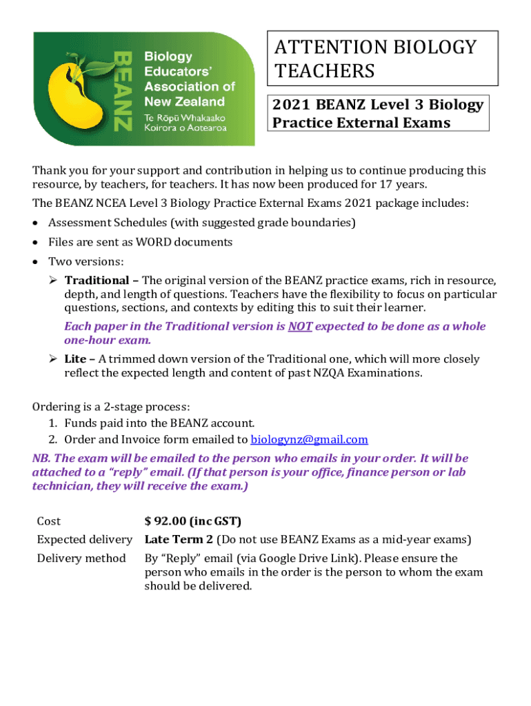 ATTENTION BIOLOGY TEACHERS 2021 BEANS Level 3 Biology Practice External Exams Thank you for your support and contribution in helping us to continue producing this resource, by teachers, for teachers.