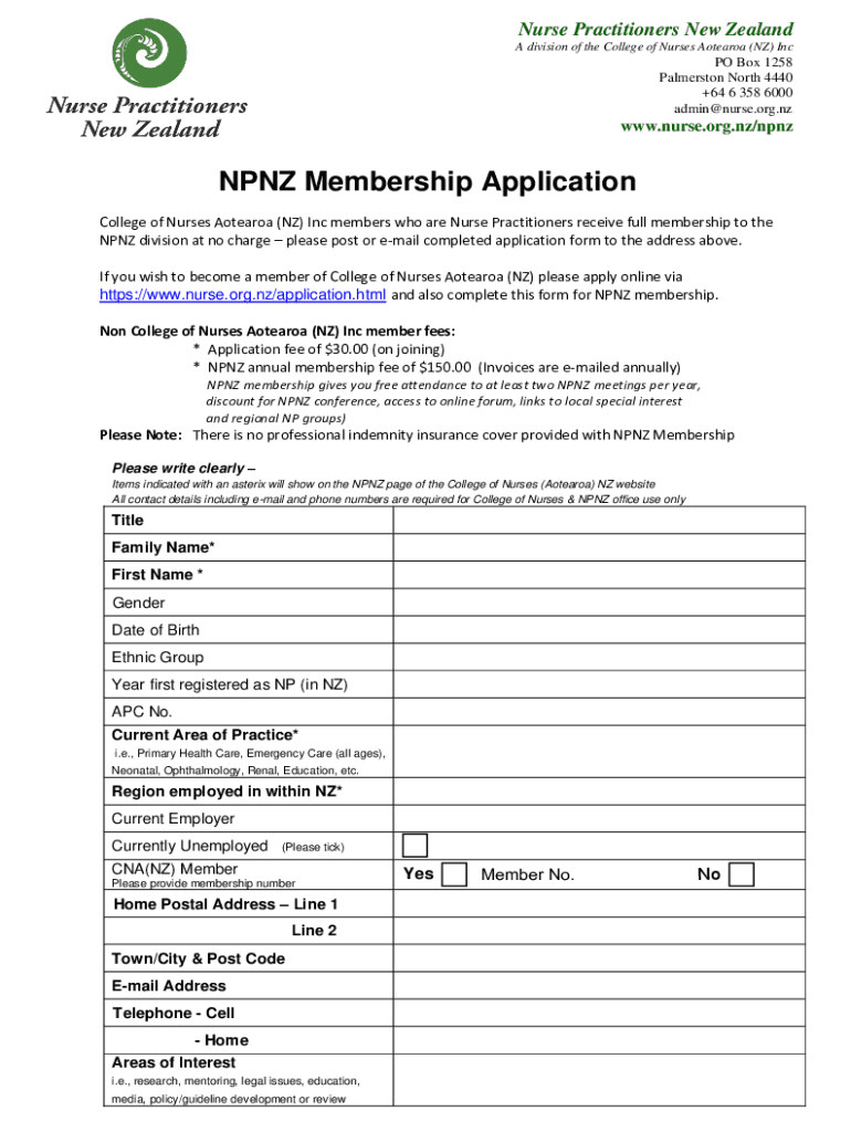 Nurse Practitioners New Zealand A division of the College of Nurses Altered (NZ) Inc PO Box 1258 Palmerston North 4440 +64 6 358 6000 admin@nurse.org.nzwww.nurse.org.nz/npnzNPNZ Membership Application