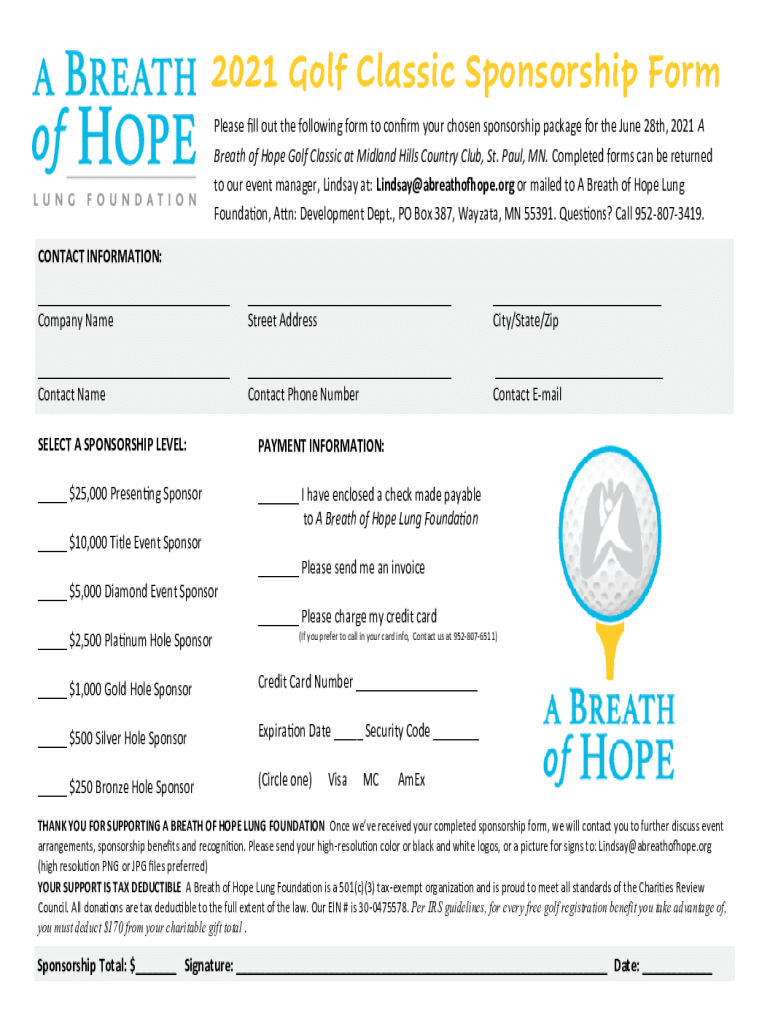 2021 Golf Classic Sponsorship Form Please fill out the following form to confirm your chosen sponsorship package for the June 28th, 2021 A Breath of Hope Golf Classic at Midland Hills Country Club,