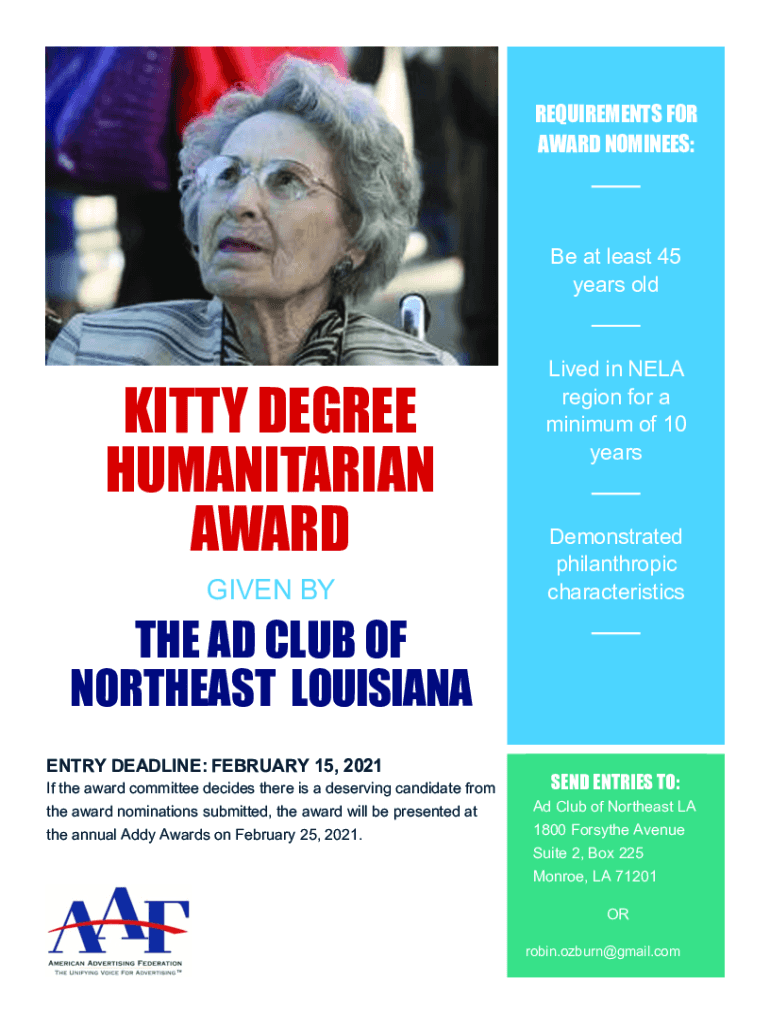 REQUIREMENTS FOR AWARD NOMINEES:Be at least 45 years Kitty DEGREE HUMANITARIAN AWARD GIVEN BYTE AD CLUB OF NORTHEAST LOUISIANA ENTRY DEADLINE: FEBRUARY 15, 2021, If the award committee decides there