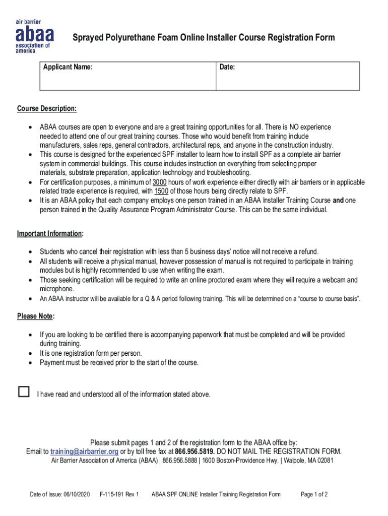 Sprayed Polyurethane Foam Online Installer Course Registration Form Applicant Name:Date:Course Description: x × x cabal courses are open to everyone and are a great training opportunities for all.