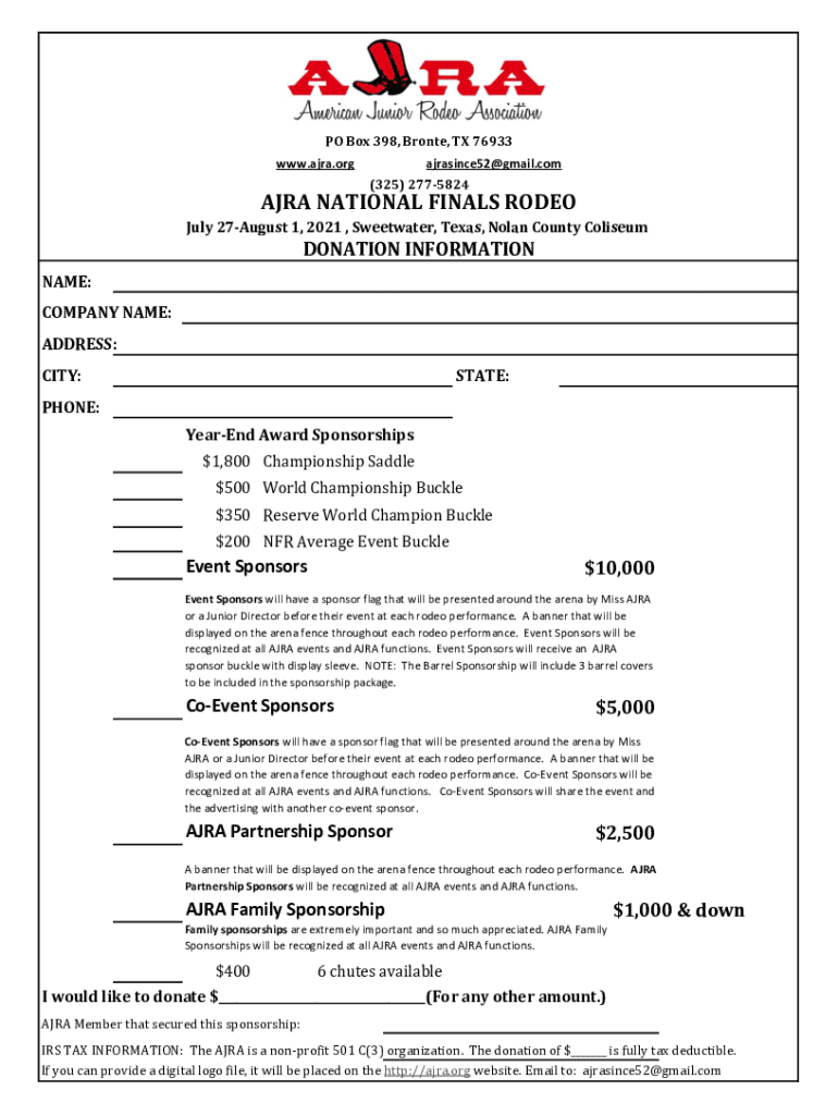 PO Box 398, Bronte, TX 76933 www.ajra.orgajrasince52@gmail.com (325) 2775824AJRA NATIONAL FINALS RODEO July 27August 1, 2021, Sweetwater, Texas, Nolan County ColiseumDONATION INFORMATION NAME: COMPANY