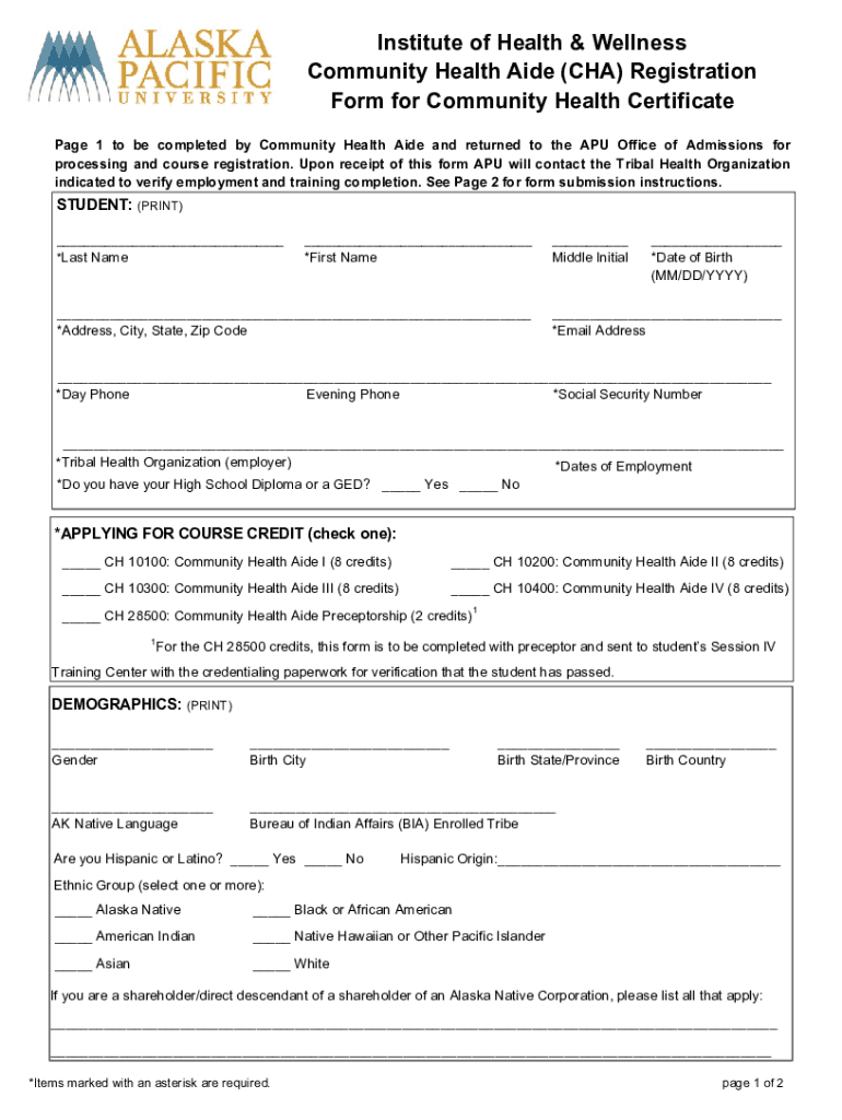 Institute of Health & Wellness Community Health Aide (CIA) Registration Form for Community Health Certificate Page 1 to be completed by Community Health Aide and returned to the APU Office of Admissions