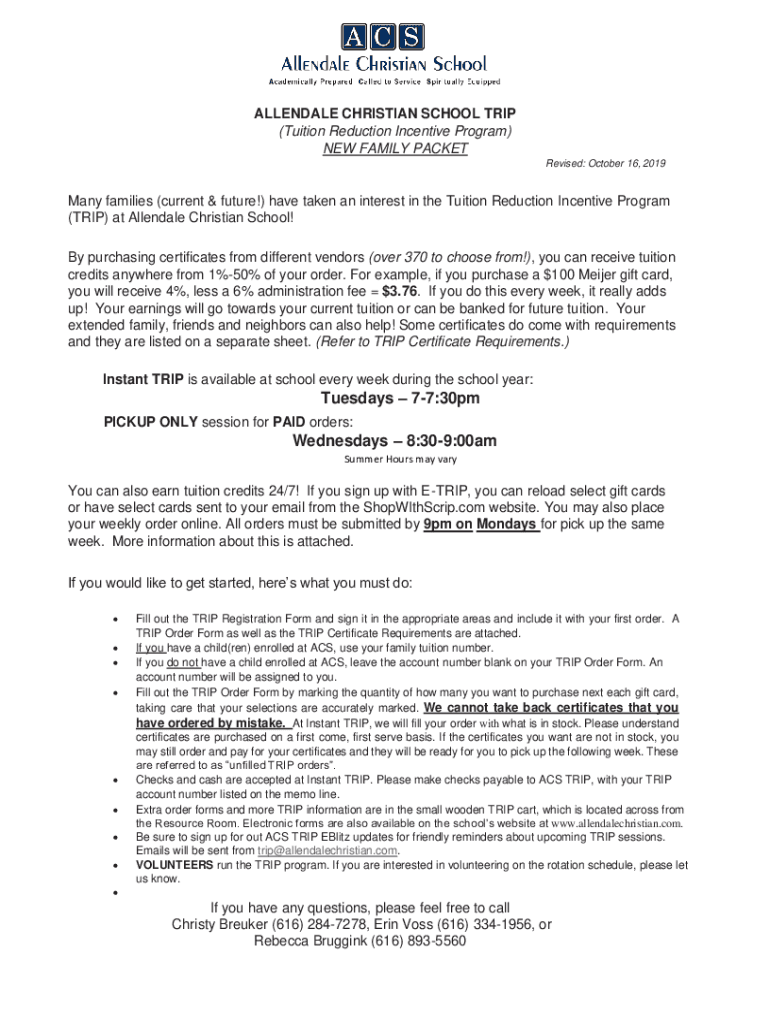 ALLENDALE CHRISTIAN SCHOOL TRIP (Tuition Reduction Incentive Program) NEW FAMILY PACKET Revised: October 16, 2019Many families (current & future!) have taken an interest in the Tuition Reduction Incentive