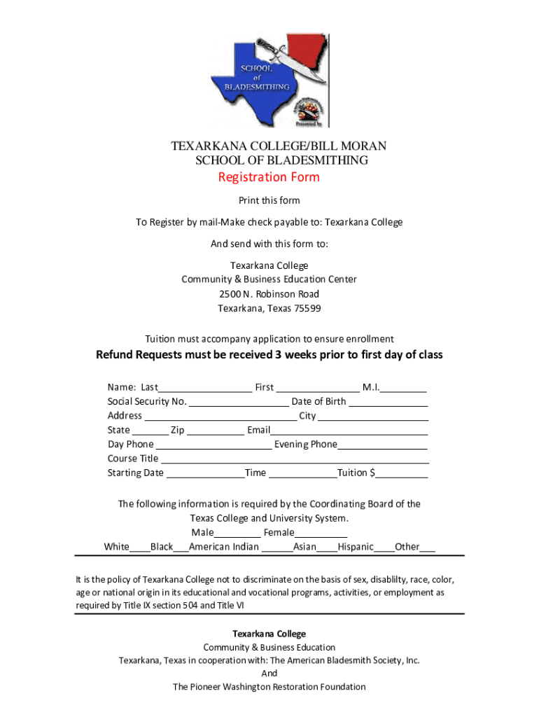 TEXARKANA COLLEGE/BILL MORAN SCHOOL OF BLADESMITHINGRegistration Form Print this form Register by mailman check payable to: Texarkana College And send with this form to: Texarkana College Community