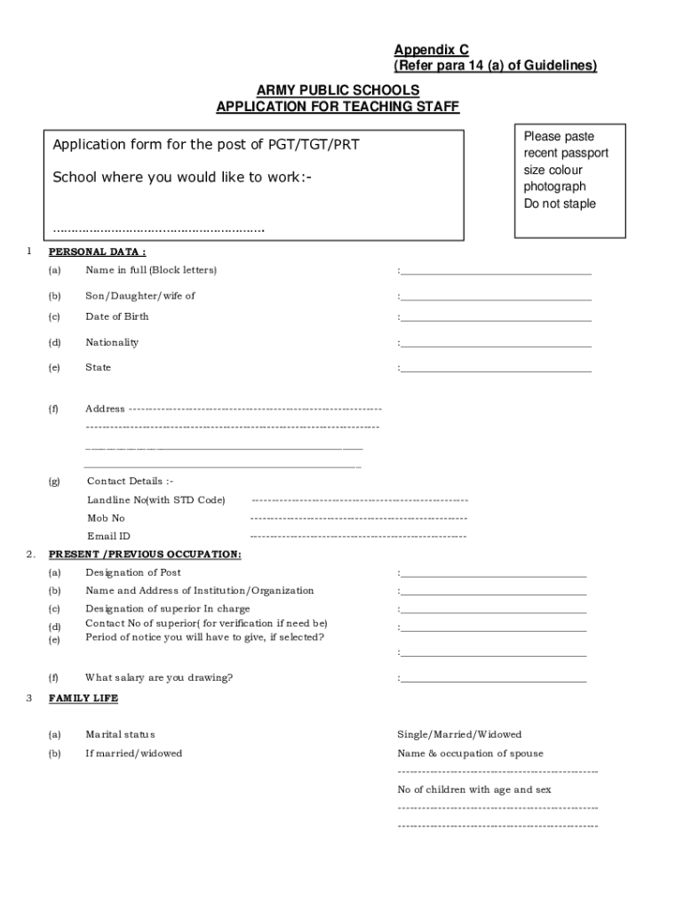 Appendix C (Refer para 14 (a) of Guidelines) ARMY PUBLIC SCHOOLS APPLICATION FOR TEACHING STAFF Please paste recent passport size color photograph Do not stapleApplication form for the post of PGT/TNT/PRT