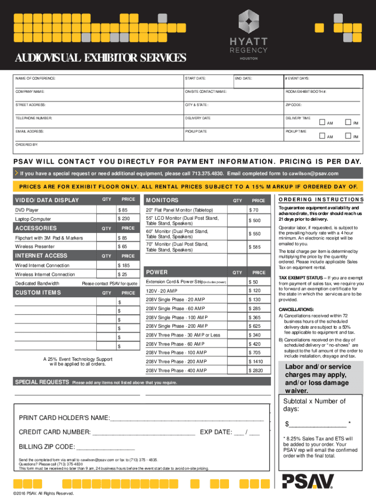 AUDIOVISUAL EXHIBITOR SERVICES NAM E OF CONFERENCE:START DATE:END DATE:# EVENT DAYS:COMP ANY NAM E:ONSITE CONTACT NAM E:ROOM /EXHIBIT BOOTH #:STREET ADDRESS:CITY & STATE :ZIP CODE:TELEPHONE SUM BER:DELIVERY