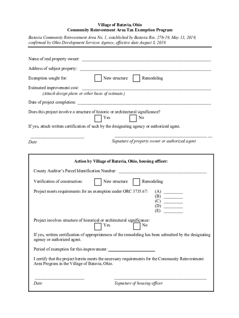 Village of Batavia, Ohio Community Reinvestment Area Tax Exemption Program Batavia Community Reinvestment Area No. 1, established by Batavia Res. 27619, May 13, 2019, confirmed by Ohio Development