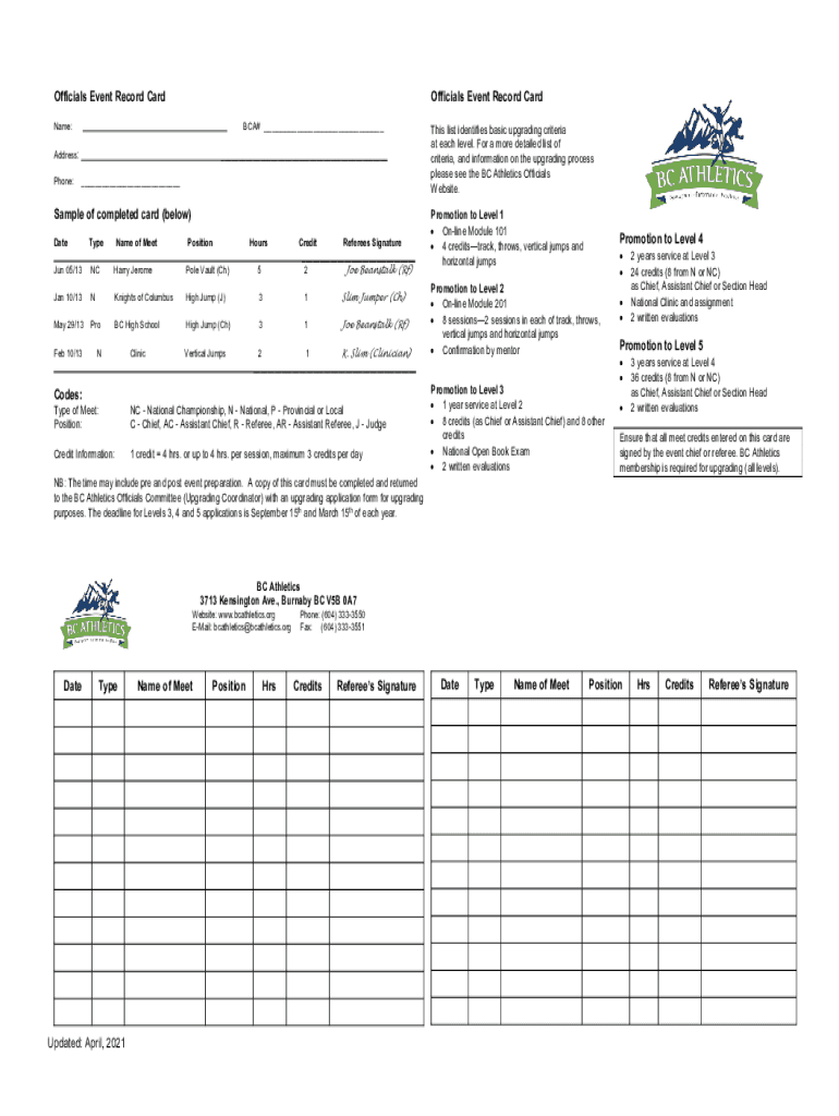 Officials Event Record CardOfficials Event Record Card BCA# Name: Address: Phone: Sample of completed card (below) DateTypeName of Meet Jun 05/13NCHarry Jerome Pole Vault (Ch)5Jan 10/13NKnights of