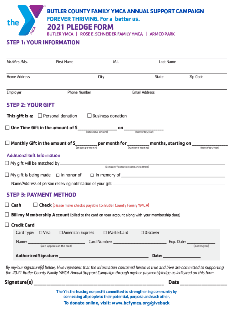 BUTLER COUNTY FAMILY YMCA ANNUAL SUPPORT CAMPAIGN FOREVER THRIVING. For a better us.2021 PLEDGE FORMATTER YMCA ROSE E. SCHNEIDER FAMILY YMCA ARAMCO PARKS TEP 1: YOUR INFORMATION Mr./Mrs./Ms. M.I.