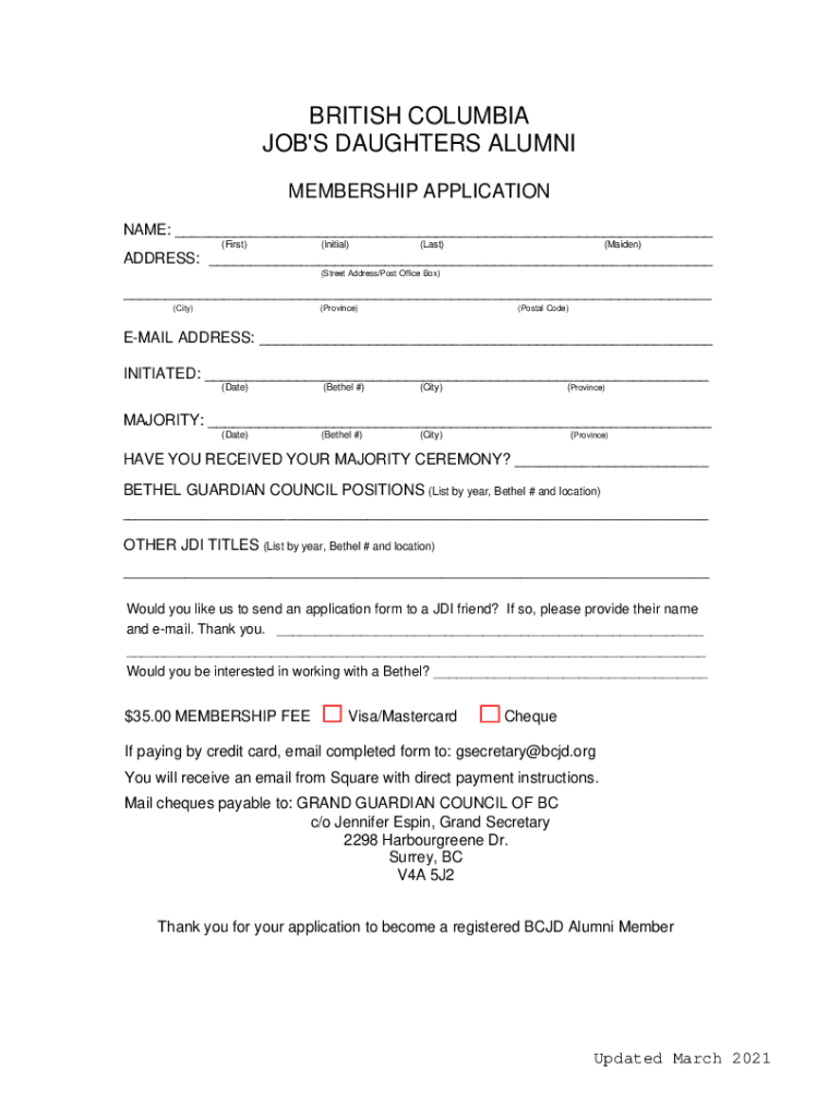 BRITISH COLUMBIA JOB IS DAUGHTERS ALUMNI MEMBERSHIP APPLICATION NAME: (First)(Initial)(Last)(Maiden)ADDRESS: (Street Address/Post Office Box) (City)(Province)(Postal Code)EMAIL ADDRESS: INITIATED: