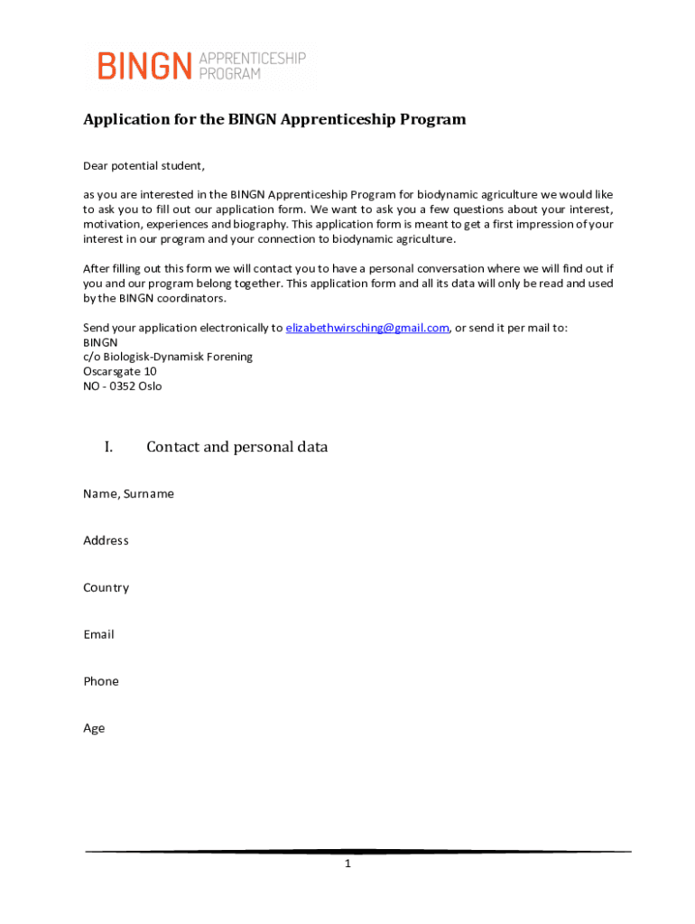 Application for the BINGE Apprenticeship Programmer potential student, as you are interested in the BINGE Apprenticeship Program for biodynamic agriculture we would like to ask you to fill out our