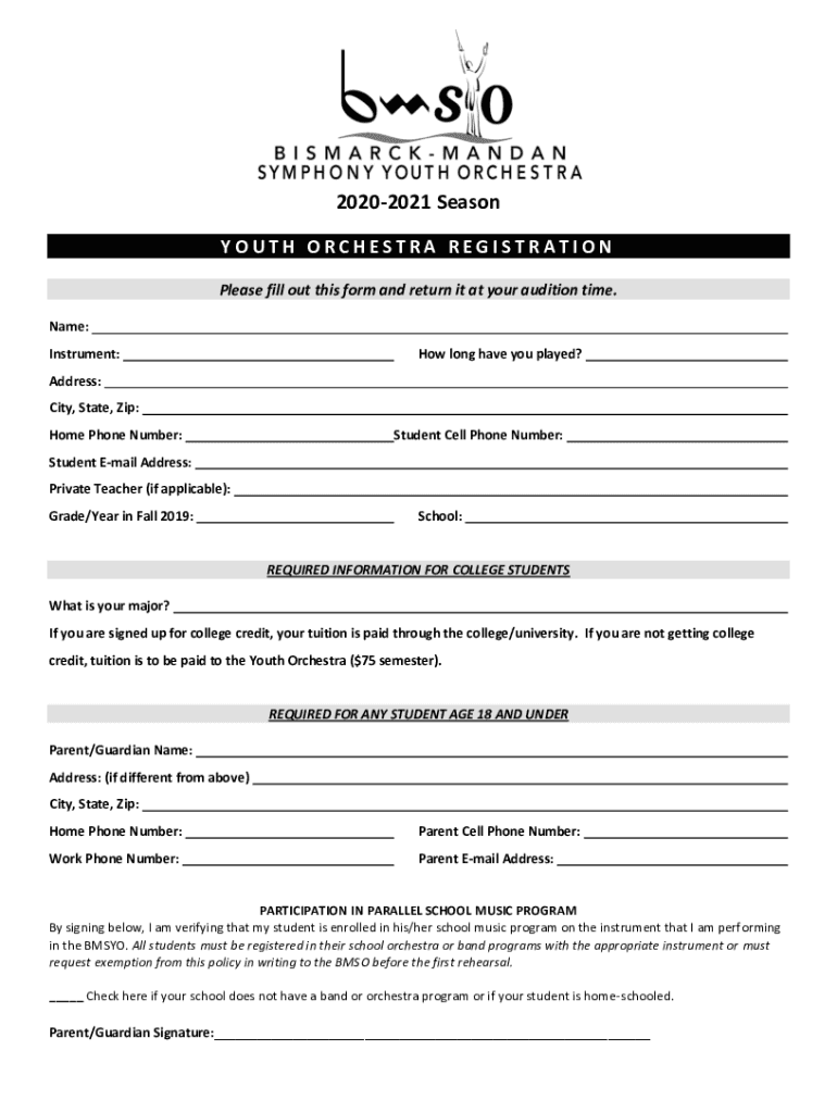 20202021 Season YOUTH ORCHESTRA REGISTRATION Please fill out this form and return it at your audition time. Name: Instrument:How long have you played? Address: City, State, Zip: Home Phone Number:Student