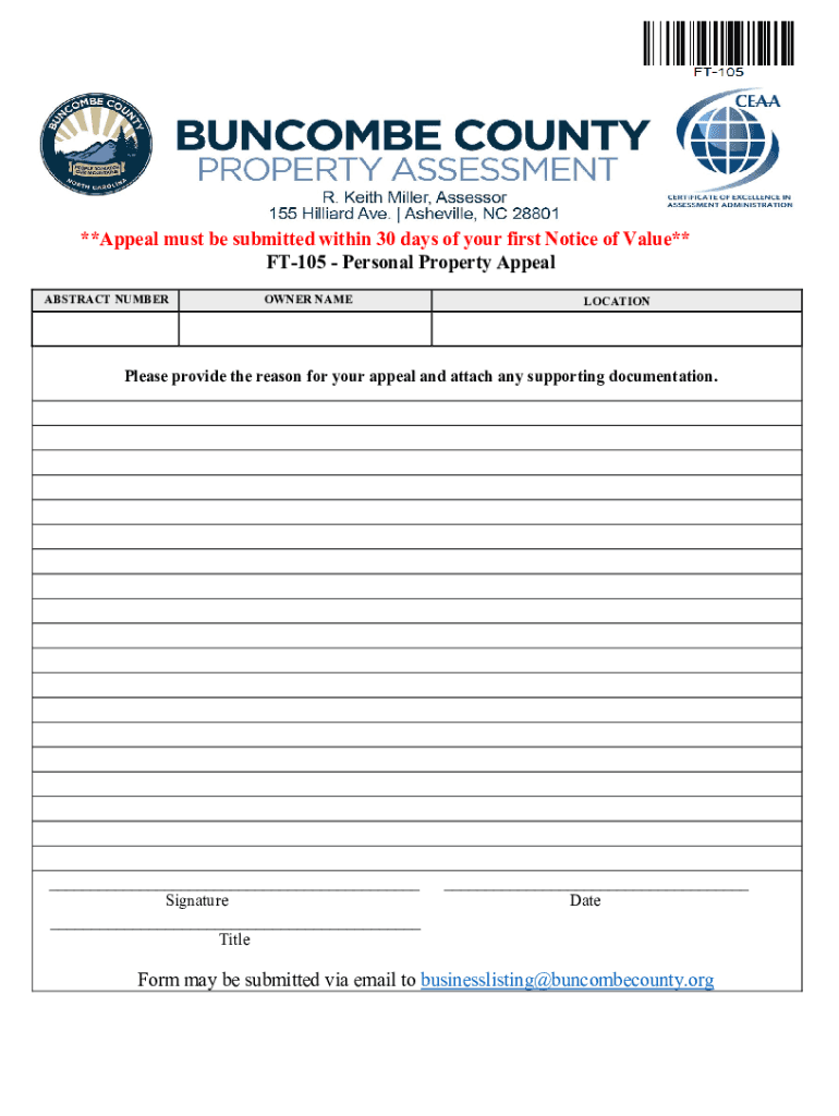 **Appeal must be submitted within 30 days of your first Notice of Value** FT105 Personal Property Appeal ABSTRACT NUMBEROWNER NAMELOCATIONPlease provide the reason for your appeal and attach any supporting