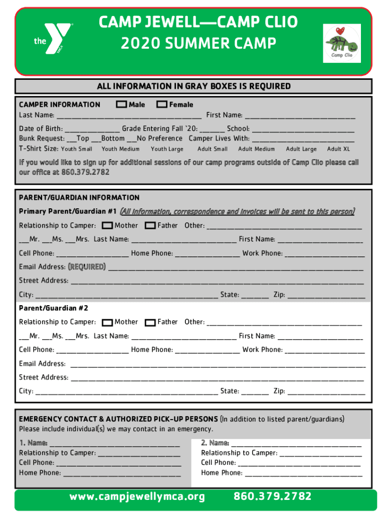 CAMP JEWELLCAMP CLIO 2020 SUMMER CAMP ALL INFORMATION IN GRAY BOXES IS REQUIRED CAMPER INFORMATION Male Female Last Name: First Name: Date of Birth: Grade Entering Fall 20: School: Bunk Request: Top